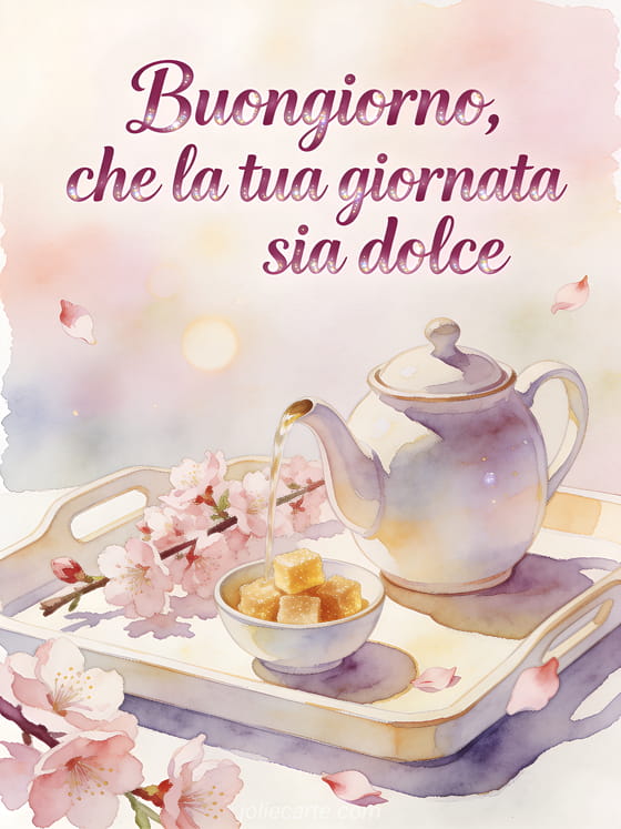 Invia una dolce cartolina di buongiorno con una teiera di ceramica che versa accanto a rami di fiori di ciliegio e una piccola ciotola di cubetti di zucchero dorato su un luminoso vassoio da colazione. Scopri anche un un messaggio di buongiorno alla sua amata, un messaggio di testo buongiorno o dei biglietti buongiorno.