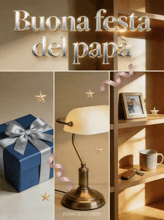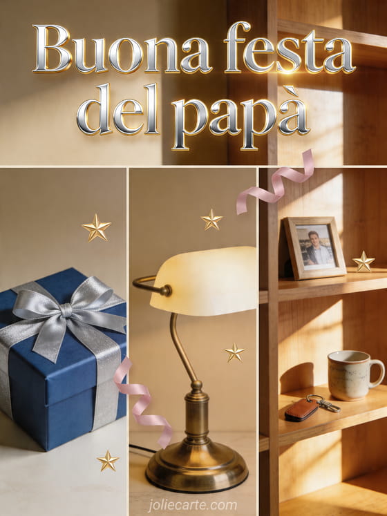 Condividi un biglietto caldo e realistico per la Festa del PapĂ con una scatola regalo blu, una lampada da scrivania classica e uno scaffale in legno illuminato con piccoli ricordi, nastri e stelle. Questo design elegante Ăš semplice, gioioso e facile da inviare. Scopri anche biglietto cuore per la Festa del PapĂ , buona festa papĂ e mamma o buona festa del papĂ per mio figlio.