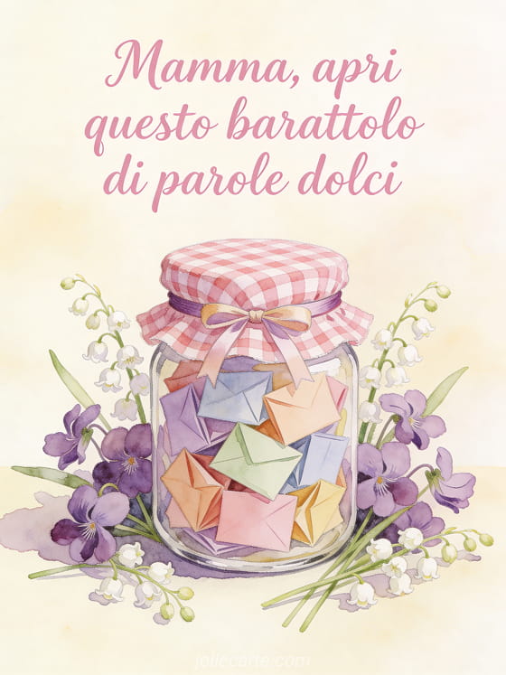 Invia questo tenero biglietto per la festa della mamma come un barattolo pieno di parole affettuose. Scopri anche buona domenica di festa della mamma, invito festa della mamma e biglietto buona festa della mamma.