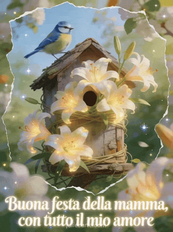 Condividi un biglietto affettuoso per la festa della mamma con una cinciarella, una casetta rustica per uccelli avvolta da emerocallidi e luce fresca di frutteto. Scopri anche testo per la festa della mamma, poesie per la festa della mamma o immagini buona festa della mamma.