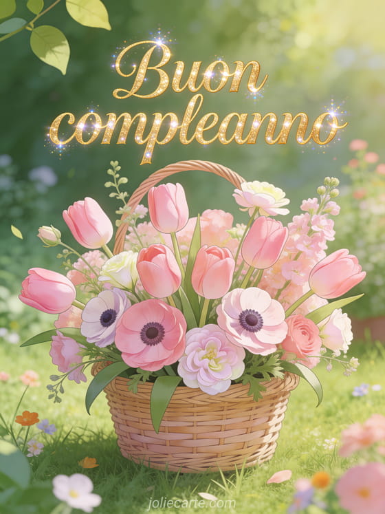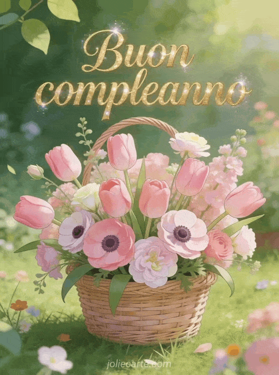 Condividi un biglietto elegante di compleanno con tulipani rosa, anemoni e lisianthus in un cestino su sfondo di giardino luminoso. Scopri anche immagine buon compleanno con fiori, buon compleanno musicale e buon compleanno gatto gif.