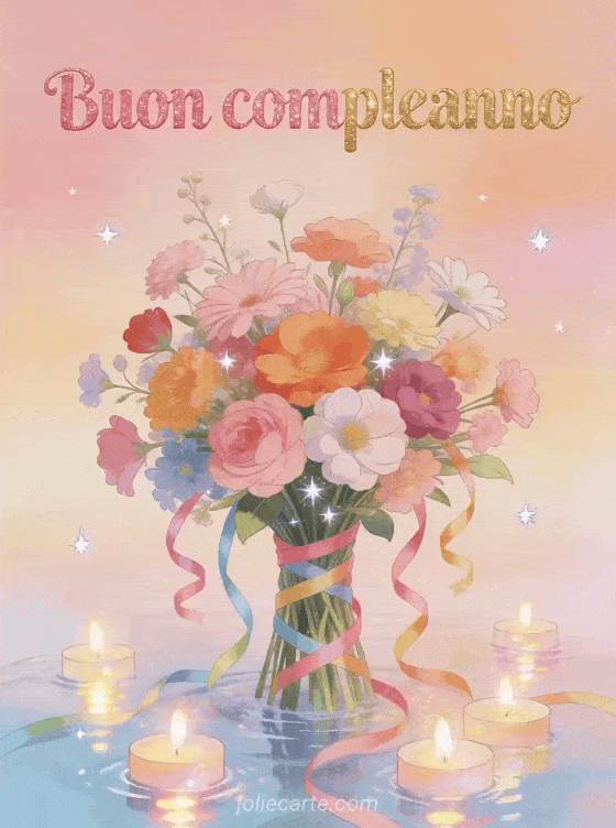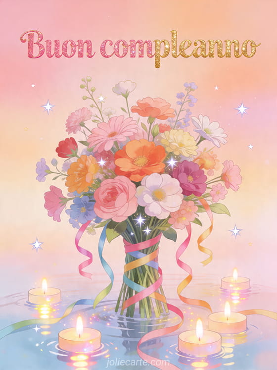 Condividi un allegro augurio di compleanno con questo delicato biglietto floreale con fiori colorati, candele fluttuanti e stelle scintillanti su uno sfondo pastello. Scopri anche lettera per augurare buon compleanno, bouquet di fiori buon compleanno e buon compleanno con mascherina coronavirus.