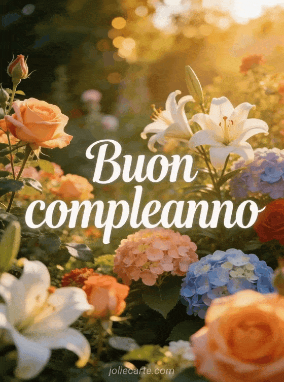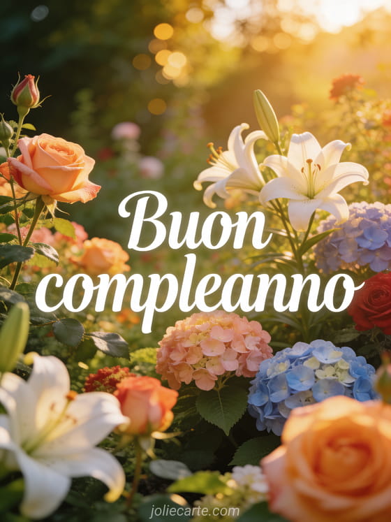 Invia questa stupenda cartolina di compleanno con rose, gigli e ortensie in piena fioritura in un giardino rigoglioso immerso nella luce dorata del pomeriggio con un meraviglioso effetto bokeh naturale. Una cartolina fotorealistica e gratuita per lei. Scopri anche foto buon compleanno donna o biglietti di buon compleanno donna.