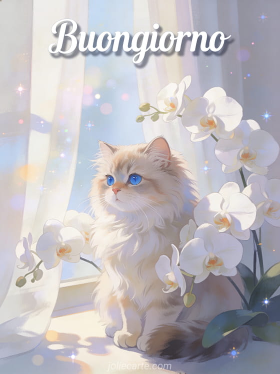 Invia questo elegante buongiorno con un gatto persiano soffice seduto tra orchidee bianche nella delicata luce del mattino. Scopri anche una cartolina ciao come stai o una cartolina buongiorno del mattino.