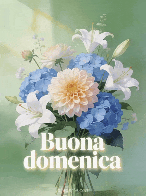 Condividi un saluto elegante di domenica con una composizione floreale spettacolare di dalie, ortensie blu e gigli bianchi su uno sfondo verde delicato. Puoi anche inviare buona domenica messaggio o buongiorno buona domenica.