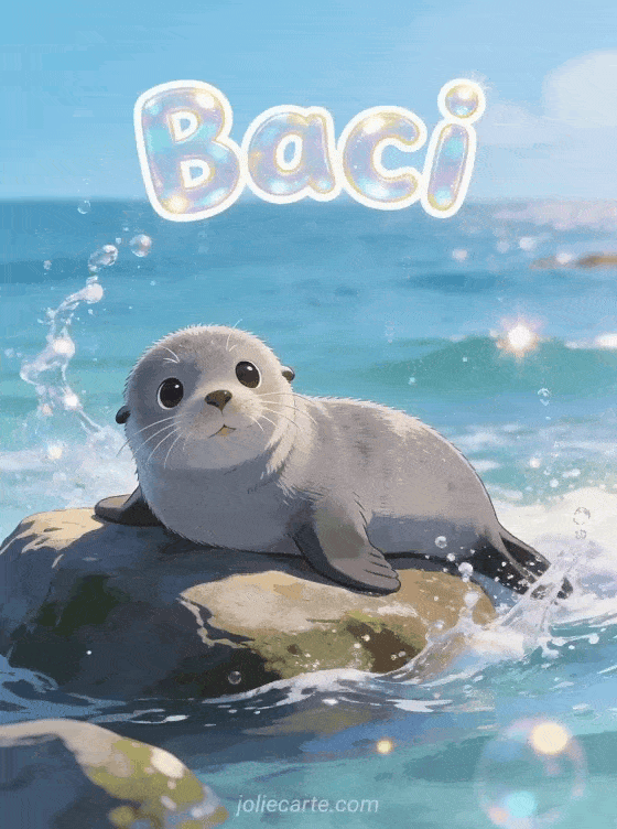 Manda allegri baci con questo incantevole biglietto con una adorabile foca grigia su uno scoglio in riva al mare. Scopri anche cartolina bacioni o teneri baci animati.