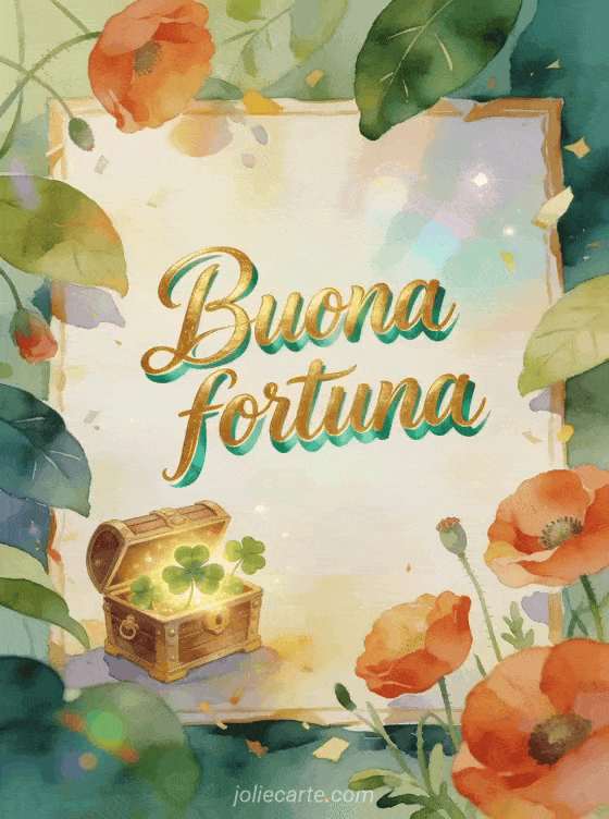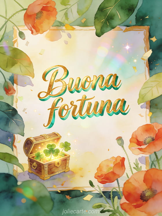 Augura buona fortuna con un piccolo scrigno del tesoro che brilla di quadrifogli fortunati, papaveri e foglie larghe in luce radiosa ad acquerello. Puoi inviare anche buona fortuna a tutti immagine, un messaggio per augurare buona fortuna a qualcuno o un'buona fortuna per gli esami immagine.