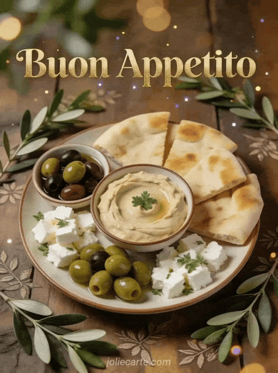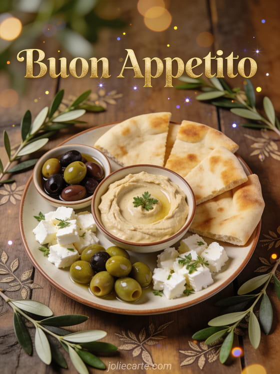 Condividi la gioia di un bel pasto con questa elegante carta del mezze mediterraneo. Scopri anche una immagine buon appetito umorismo o un gif buon appetito.
