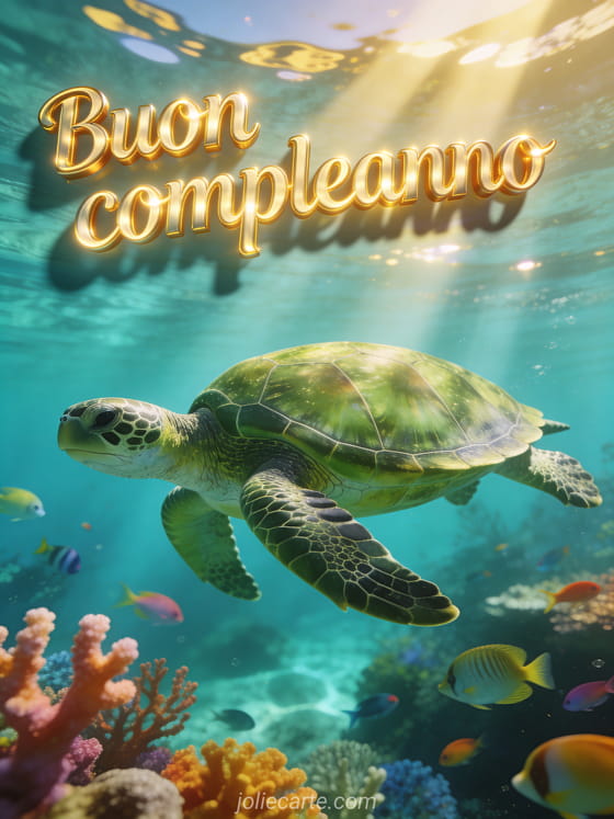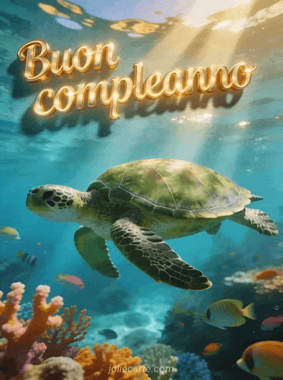 Invia uno straordinario biglietto di compleanno con una tartaruga marina verde che nuota aggraziata in acque cristalline turchesi, con raggi di sole che filtrano dalla superficie e coralli colorati. Scopri anche buon compleanno uomo divertente o gifs buon compleanno uomo.