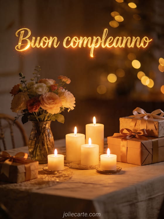 Celebra un giorno speciale con questo biglietto di compleanno caloroso e festivo con candele, fiori e regali. Scopri anche buon compleanno, sms di buon compleanno o buon compleanno giardiniere.