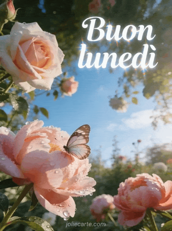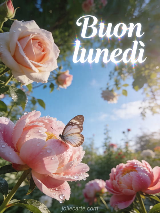 Invii un fresco messaggio di buon lunedì con questo biglietto fotorealistico che mostra rose, peonie e una farfalla nella rugiada del mattino. Scopra anche immagine per dire buon lunedì, cartolina buona giornata lunedì o messaggio buon lunedì e buona settimana citazione.