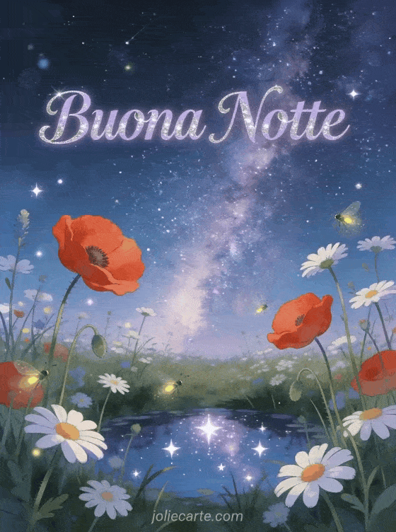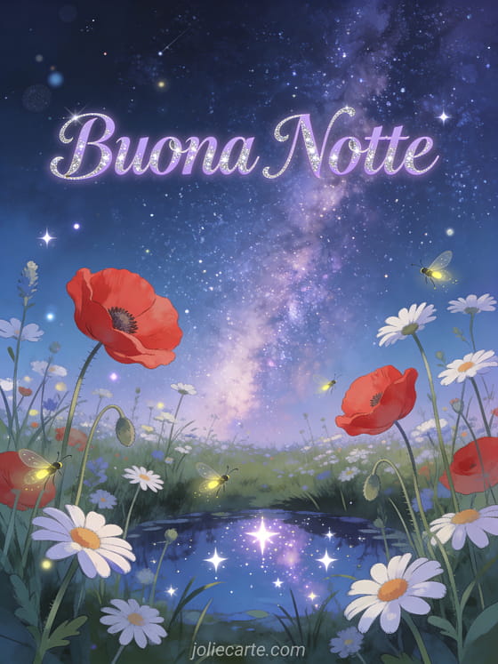 Augura la buona notte con questo splendido biglietto che mostra un prato di papaveri rossi e margherite bianche sotto uno spettacolare cielo notturno con la Via Lattea, stelle riflesse in uno stagno e lucciole che danzano tra i fiori. Scopri anche un pensiero della buona notte o un messaggio buonanotte carino.