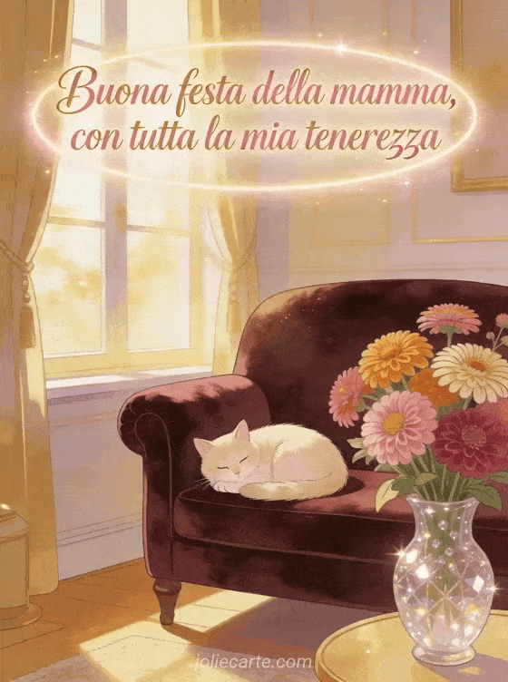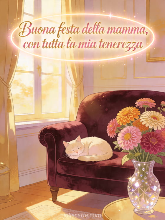 Condividi una scena calda in un salotto di velluto dove un gatto crema riposa accanto a zinnie e a un vaso di cristallo nella luce dorata. Puoi inviare anche poema della festa della mamma, poesia per la festa della mamma o disegni per la festa della mamma.