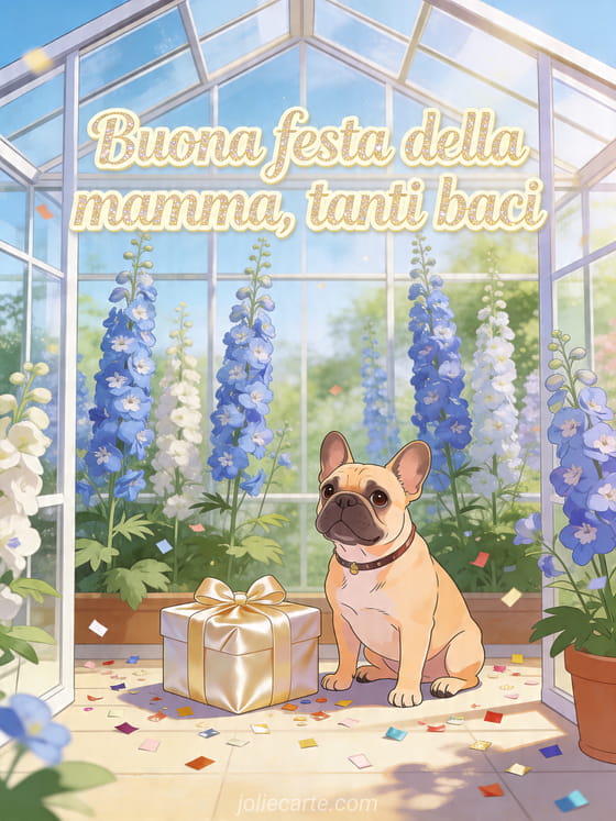 Condividi una fotografia per la festa della mamma con lettere crema, glitter delicato e una serra luminosa piena di delfini alti. Un bouledogue francese siede accanto a una scatola regalo in raso e coriandoli sparsi in questo biglietto gioioso. Scopri anche parole tenere per la festa della mamma, poesia per la festa della mamma o buona festa della mamma immagini.