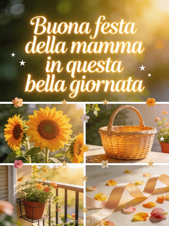 Condividi fotografie per la festa della mamma in un biglietto realistico a quattro pannelli con girasoli radianti, un cesto di vimini, un angolo di balcone al sole, nastri, petali e piccole stelle. Scopri anche poesie festa della mamma, rime per la festa della mamma o fiore per la festa della mamma.