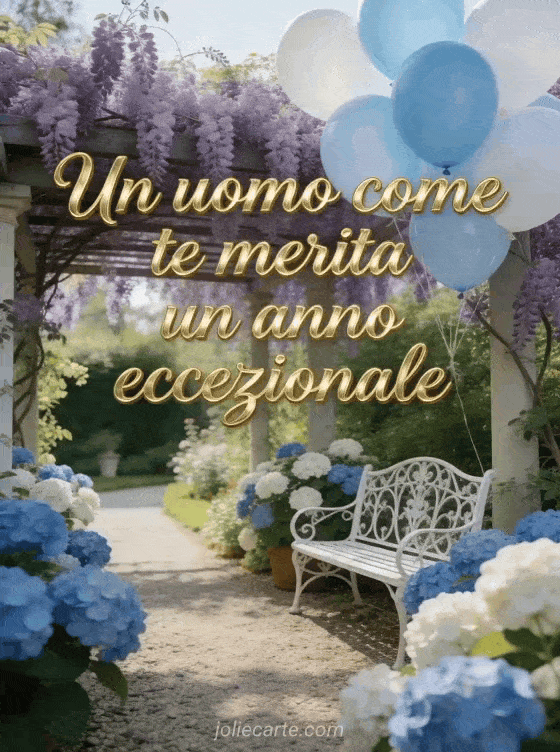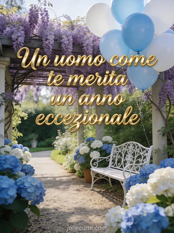 Festeggia un uomo speciale con questa elegante cartolina di compleanno con un magnifico giardino inglese con ortensie blu e bianche in piena fioritura, una panchina in ferro battuto bianca, un pergolato coperto di glicine e palloncini pastello. Scopri anche un biglietto di buon compleanno uomo gratis o un testo biglietto compleanno uomo.