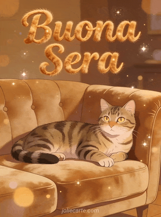 Invia una accogliente buona sera con gatto con questa elegante cartolina gratis. Un elegante gatto tigrato con occhi brillanti comodamente sdraiato su un divano di velluto con atmosfera casalinga in toni ambra caldi, perfetta per un saluto serale accogliente. Scopri anche una cartolina buonasera davanti al camino o una cartolina buonasera divertente grazie.