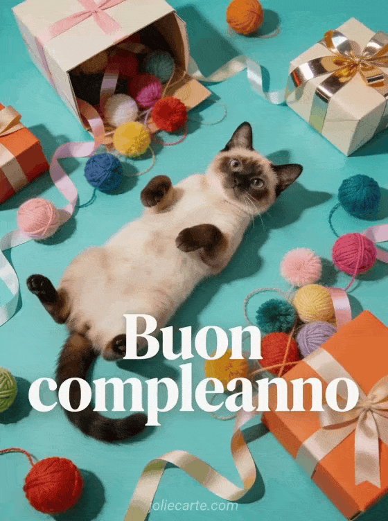Festeggia con una cartolina animata di compleanno con gatto siamese, lana colorata, nastri e regali festosi. Scopri anche bella cartolina compleanno gratis animata, cartolina compleanno animata e immagine animata buon compleanno.