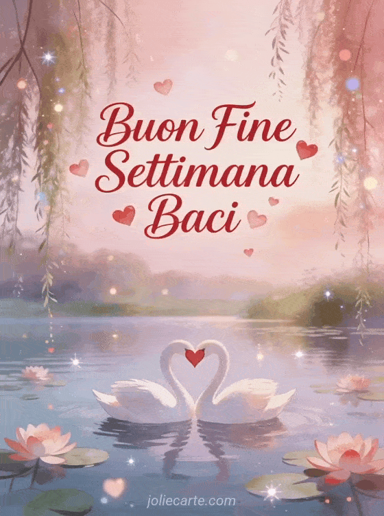 Condividi un tenero saludo animato con due cigni che formano un cuore tra ninfee. Scopri anche una buon fine settimana immagini o una buon fine settimana a voi.