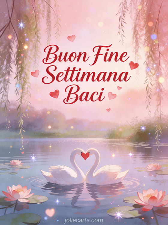 Gif animata buon fine settimana baci un romantico saluto di fine settimana con cigni che formano un cuore su un lago sereno e cuori fluttuanti