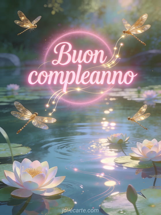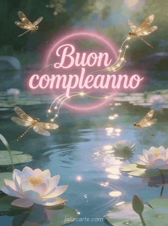 Invia questa bellissima gif animata di compleanno per donna con libellule dorate e ninfee fiorite. Scopri anche una gif buon compleanno donna o una parole anniversario donna.