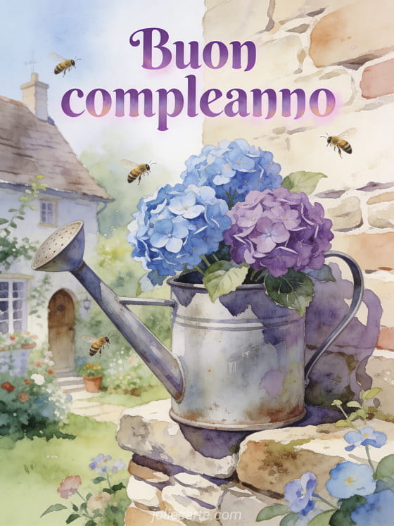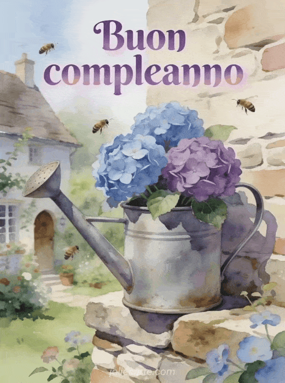 Invia questo gif animato di buon compleanno con ortensie blu e viola in un annaffiatoio vintage pieno di fascino. Scopri anche un biglietto di buon compleanno animato gratis o un biglietto animato musicale di compleanno gratis.
