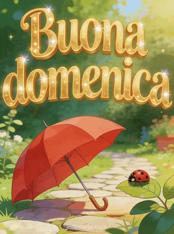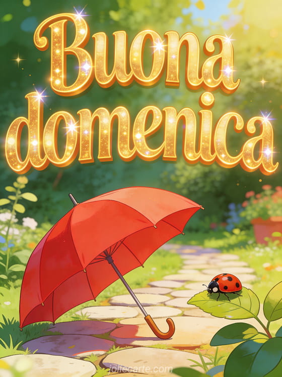 Invia un saluto allegro di buona domenica con un ombrello rosso su un sentiero di pietra in giardino e una piccola coccinella su una foglia. Scopri anche buona domenica umoristica umorismo animali, una buona domenica cartolina virtuale animata gratis o buona domenica baci umorismo.