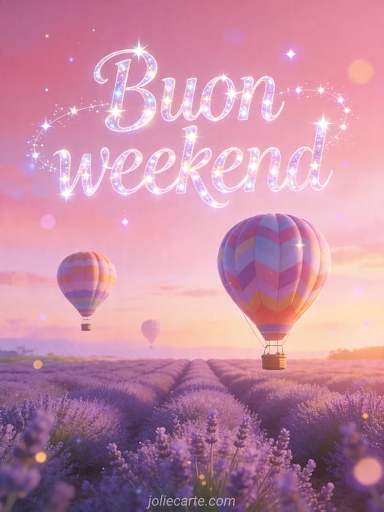 Condividi questo bellissimo biglietto di buon weekend con mongolfiere magiche, campi di lavanda e dolce luce dell'alba. Puoi anche scoprire un buon weekend, citazione buon weekend e immagine per augurare buon weekend con umorismo.
