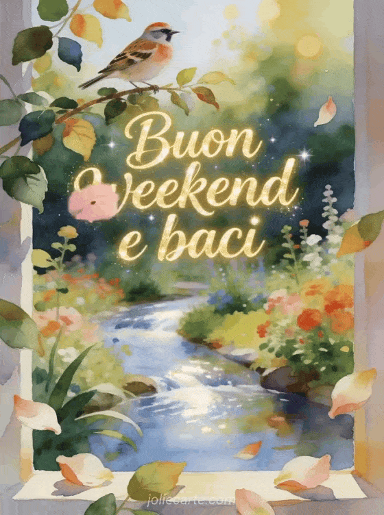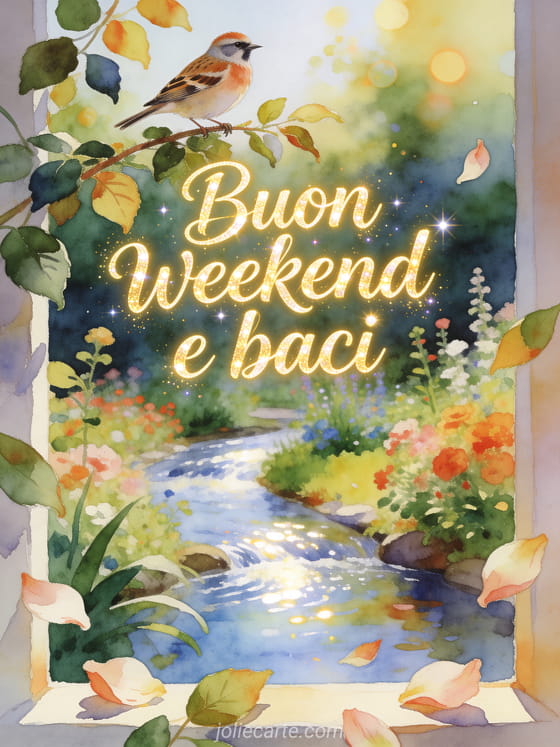 Condividi un saluto leggero di fine settimana con scritte ad acquerello, luce dorata di giardino e baci affettuosi. Scopri anche immagini buon weekend bacioni, buon fine settimana primavera o ciao buon weekend baci.