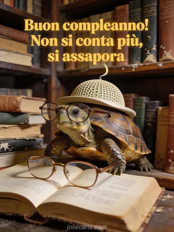 Fai ridere i tuoi cari con questo gif buon compleanno divertente con una tartaruga adorabile con occhiali da lettura e cappello a bombetta. Scopri anche un gif buon compleanno animato divertente o un umorismo animato buon compleanno per ancora più risate.