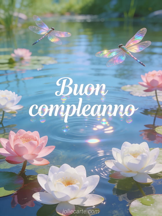 Illumina il suo giorno speciale con questo gif buon compleanno con uno stagno di ninfee in fiore e libellule iridescenti. Scopri anche un biglietto compleanno donna fiori o un auguri di compleanno donna per trovare le parole giuste.
