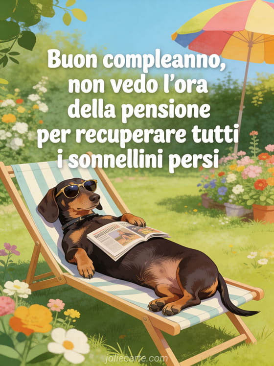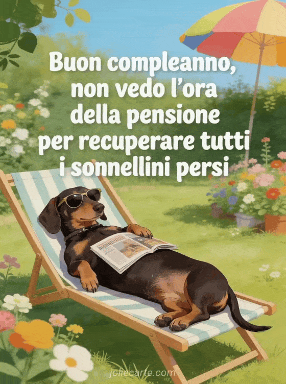 Questo divertente gif di compleanno per uomini mostra un adorabile bassotto completamente disteso su uno sdraio da giardino con occhiali da sole e una rivista sulla pancia, circondato da fiori e un parasole colorato. La carta perfetta per far ridere qualsiasi uomo nel suo compleanno. Scopri anche un bel biglietto di compleanno animato per uomo gratis o un biglietto di compleanno divertente per uomini.