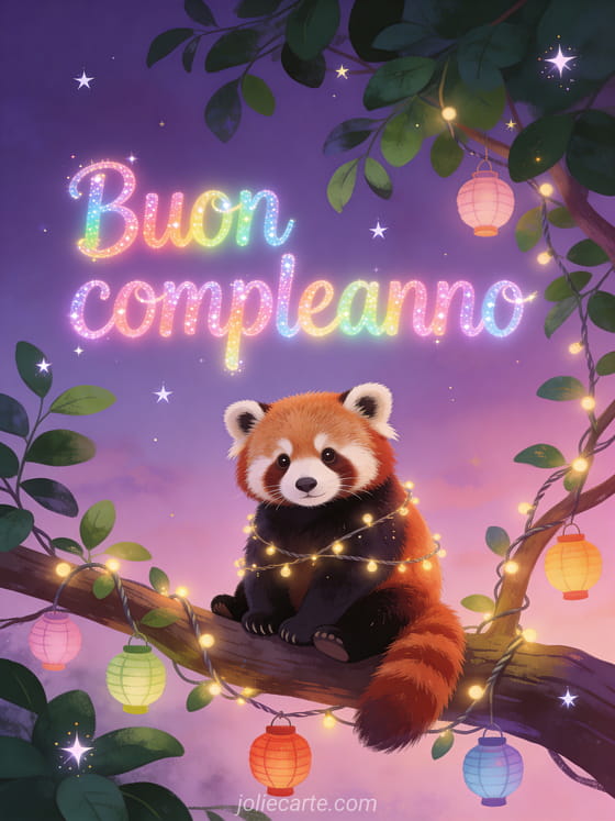Invia un incantevole biglietto di compleanno con un adorabile panda rosso seduto su un ramo decorato con lucine e lanterne colorate, circondato da rigogliosa vegetazione e stelle scintillanti al crepuscolo. Scopri anche un biglietto di buon compleanno o un biglietto di auguri di compleanno.