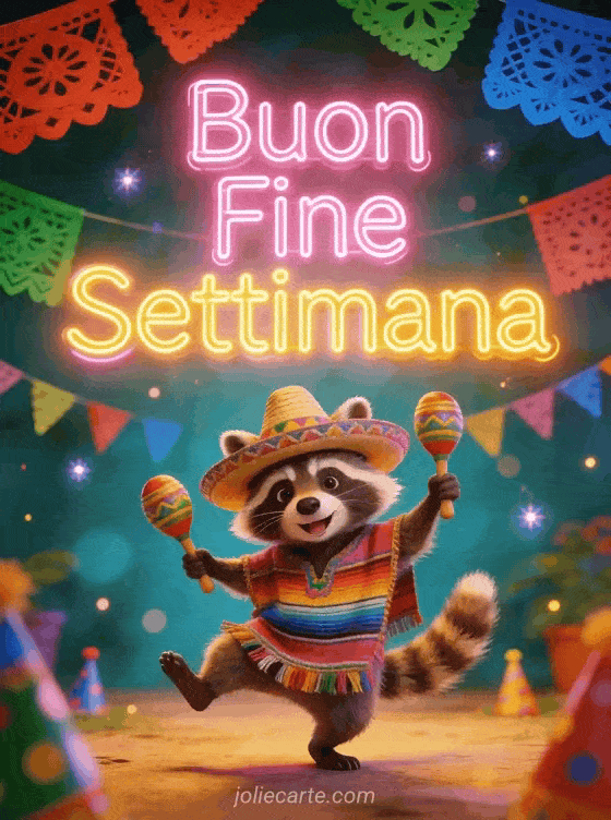 Invia un divertente augurio di buon fine settimana per iniziare con il sorriso. Un simpatico procione balla con le maracas circondato da colorate decorazioni da festa e papel picado. Scopri anche un biglietto weekend con giardino o un biglietto weekend divertente.
