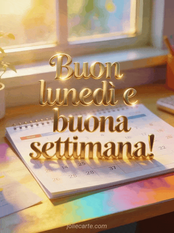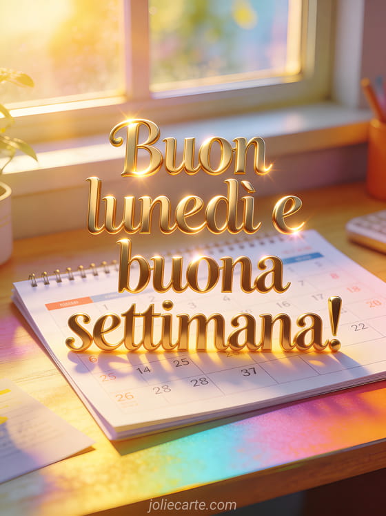 Condividi buon lunedì e buona settimana con elegante tipografia dorata, un calendario fresco su una scrivania vicino a una finestra soleggiata e luce colorata del mattino. Puoi inviare anche buon lunedì immagine animata, immagine gratuita buon lunedì buona settimana o buongiorno buon lunedì e buona settimana baci.
