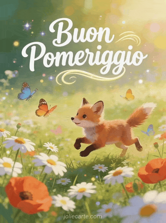 Un allegro e incantevole biglietto di buon pomeriggio con un cucciolo di volpe giocherellone che insegue le farfalle in un prato pieno di margherite e papaveri. Scopri anche un gif buon pomeriggio divertente, un immagine buon pomeriggio gattino o un buon appetito e buon pomeriggio.