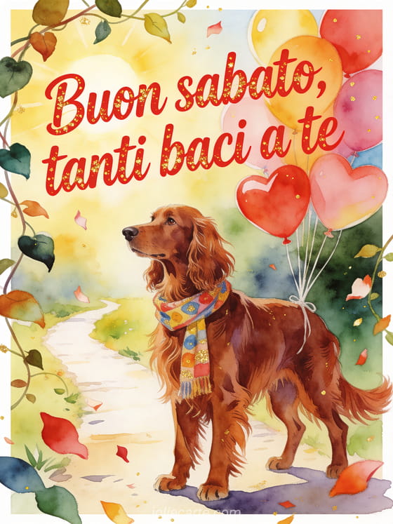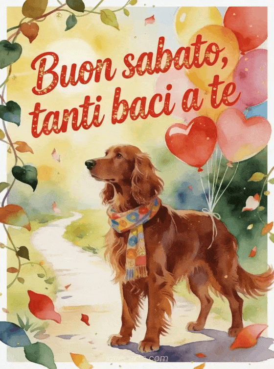 Condividi buon sabato e tanti baci con una scena colorata ad acquerello di un setter irlandese con una sciarpa giocosa accanto a palloncini a cuore su un sentiero soleggiato. Puoi inviare anche buon sabato sera gif, un buon sabato neve gif o un sabato buona giornata gif.