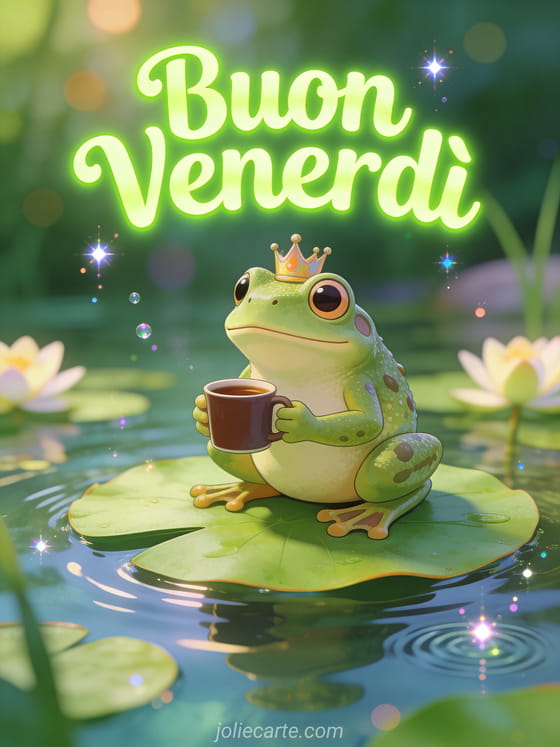 Invia un simpatico saluto di buon venerdì con una divertente rana con corona che beve caffè. Un modo spiritoso per iniziare il fine settimana con il sorriso. Scopri anche una cartolina zen buon venerdì o una cartolina ciao buon venerdì baci.