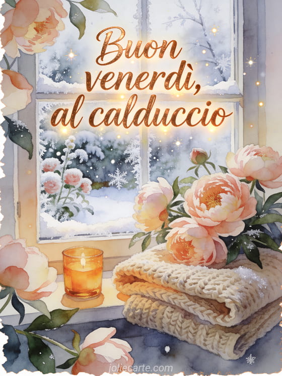 Condividi un messaggio confortante di buon venerdì con peonie accanto a una finestra gelata, una coperta di maglia piegata e luce ambrata di candela in acquerello. Scopri anche buon venerdì amici immagine, buon venerdì gif o immagine scintillante buon venerdì.