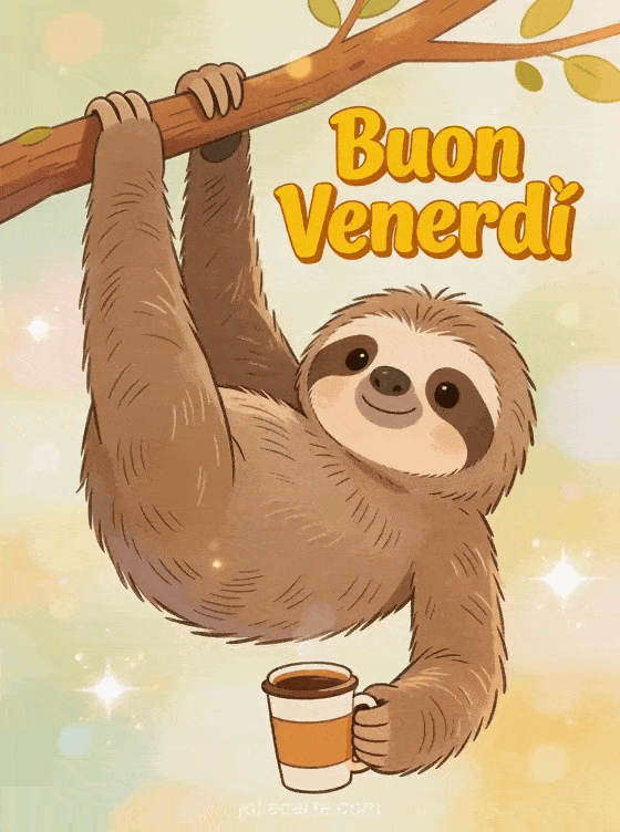 Invia un divertente augurio di buon venerdì con questa simpatica cartolina. Un adorabile bradipo a fumetti appeso a un ramo con una tazza di caffè, il perfetto umore del venerdì. Scopri anche una cartolina di venerdì con gatto, una cartolina di venerdì con riccio o una cartolina di venerdì.