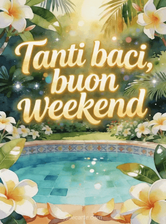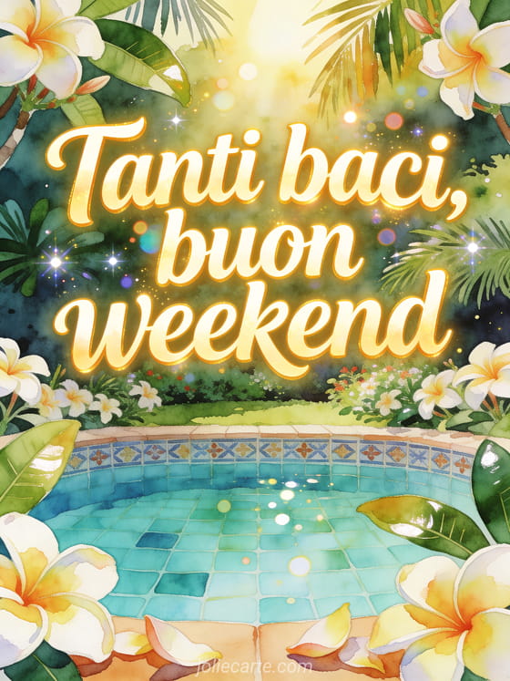 Invia una cartolina gioiosa per il weekend con scritte vivaci ad acquerello, fiori di frangipane, una piscina turchese in giardino, piastrelle decorate e luce tropicale. Scopri anche una buon weekend farfalla baci, una gif buon weekend baci o una buon weekend baci belle immagini.