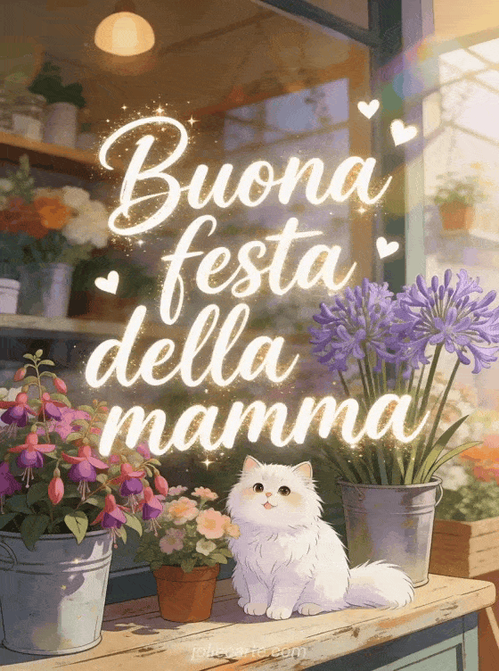 Condividi questo commovente gif buona festa della mamma. Una deliziosa boutique di fiori con fuchsie fresche e agapanti, un gatto persiano bianco seduto felice tra i fiori con cuoricini fluttuanti. Scopri anche una breve poesia per la festa della mamma o una cuore cartolina festa della mamma.