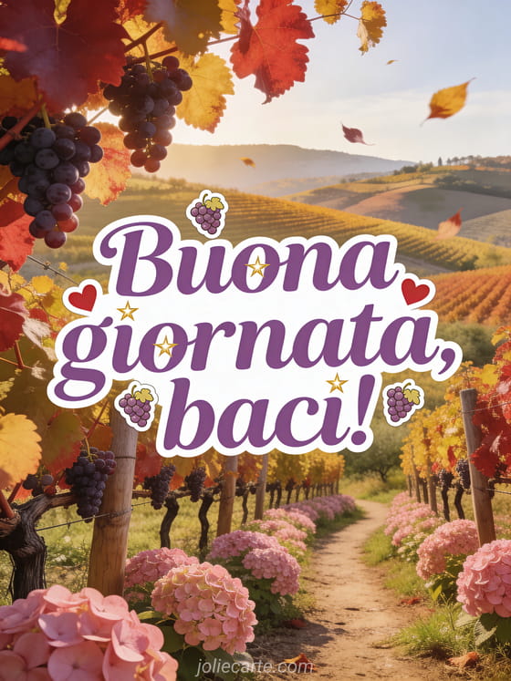 Rallegra la giornata di qualcuno con questo caloroso biglietto con vigneti ondulati in autunno, foglie di vite rosse e dorate, ortensie rosa e luce dorata autunnale. Scopri anche un biglietto animato di buongiorno o un biglietto di buongiorno con sole.