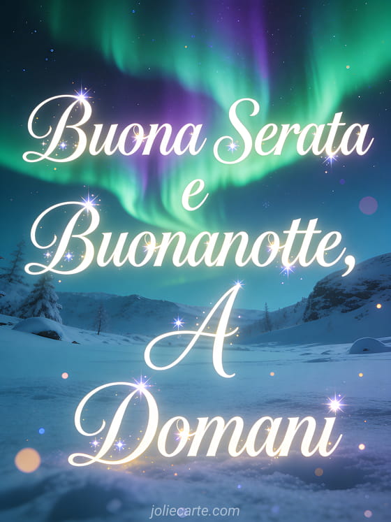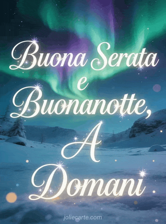 Condividi un mozzafiato gif di buona serata buonanotte a domani con magiche aurore boreali che danzano su un paesaggio innevato con onde di aurora animate in verde e viola. Scopri anche una cartolina buona sera baci a domani, una immagine buona sera e a domani o una cartolina buona sera a domani immagini.