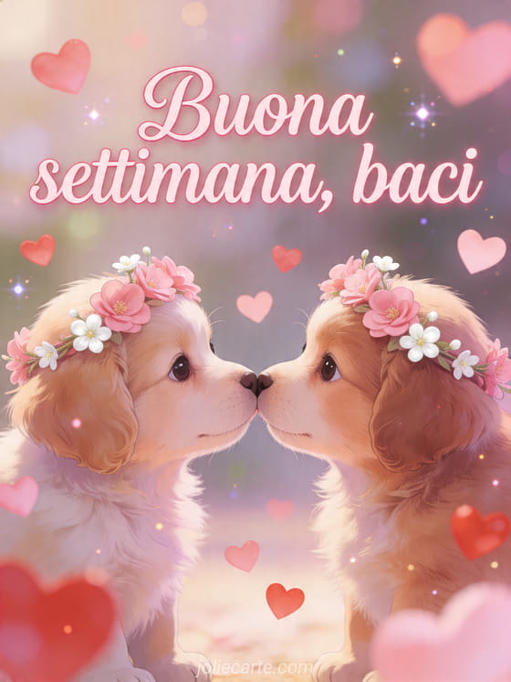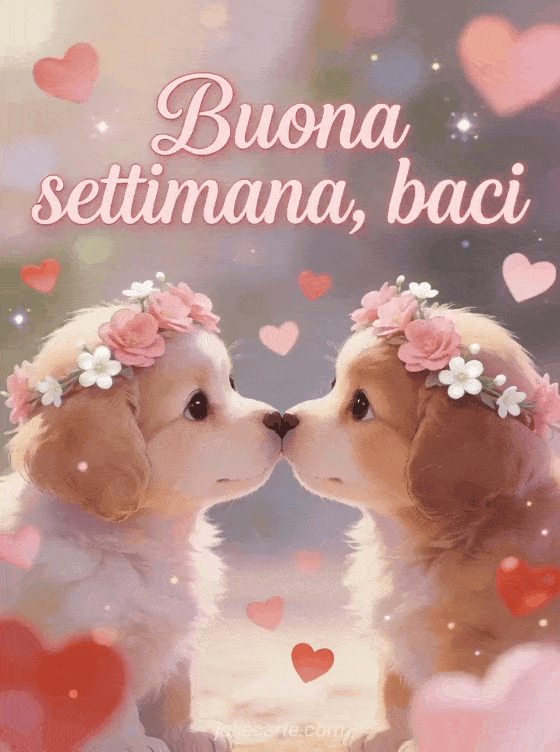 Condividi questo tenero biglietto di buona settimana, baci con due cuccioli che si toccano il naso, corone di fiori e cuori sospesi. Puoi anche scoprire messaggio buona settimana, gif buona settimana scintillante e buongiorno buona settimana gif animata.