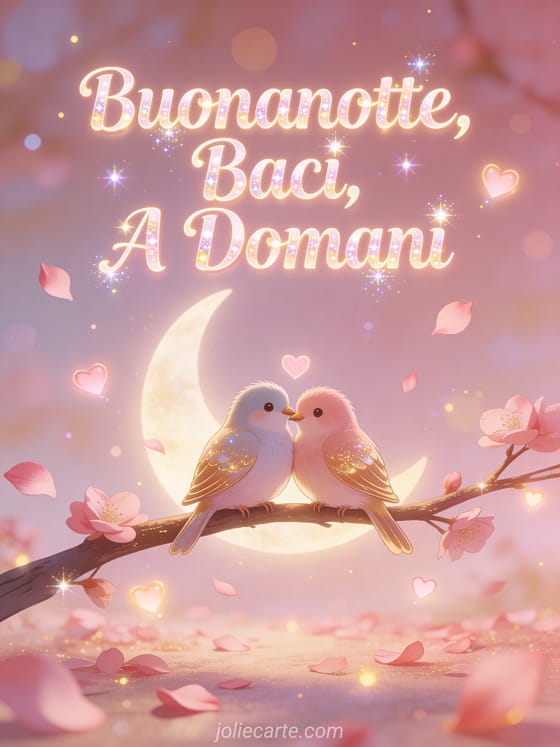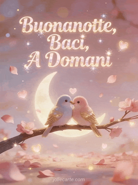Di buonanotte con romantici baci e a domani con questo tenero biglietto con due tortorelle accoccolate su un ramo al chiaro di luna con petali rosa fluttuanti e cuori luminosi. Scopri anche un buonanotte umoristica a domani, un gif buonanotte a domani o un biglietto buonanotte a domani.