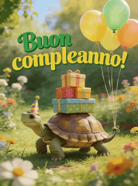 Falla ridere con questo gif di compleanno divertente con una tartaruga adorabile con cappello di festa che porta una pila di regali colorati. Scopri anche una buon compleanno cara amica cartolina o un gif buon compleanno donna divertente per altri saluti divertenti.