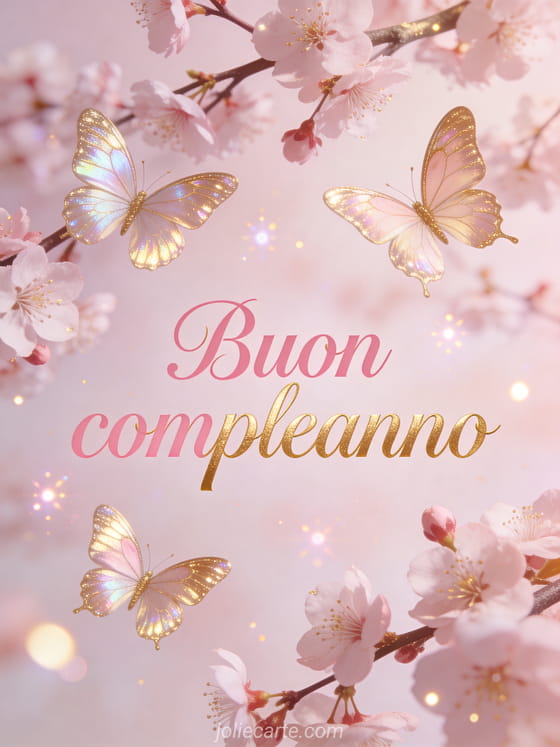 Invia un raffinato e delicato augurio di buon compleanno con farfalle iridescenti e ciliegi in fiore. Scopri anche una cartolina bouquet compleanno donna, una ecard compleanno donna o un gif compleanno donna gratuito.