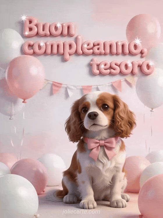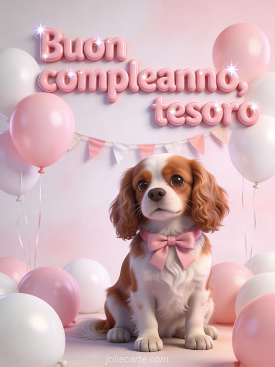 Invia un augurio carino di compleanno per tua nipote con un cane Cavalier King Charles dallo sguardo tenero, fiocco rosa al collo, palloncini pastello rosa e bianchi e una ghirlanda di bandierine. Scopri anche compleanno di mia nipote o biglietto di compleanno per mia nipote.