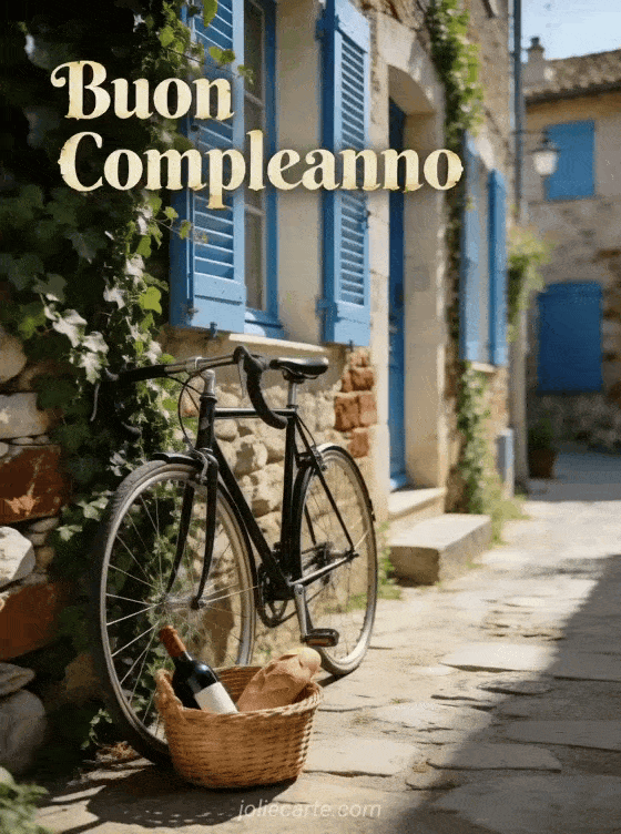 Augura un buon compleanno con questo affascinante biglietto con una bicicletta da corsa vintage contro un muro di pietra ricoperto di edera in un vicolo provenzale soleggiato. Scopri anche immagini buon compleanno uomo, un testo compleanno uomo con umorismo gratis o una citazione di compleanno per uomo.